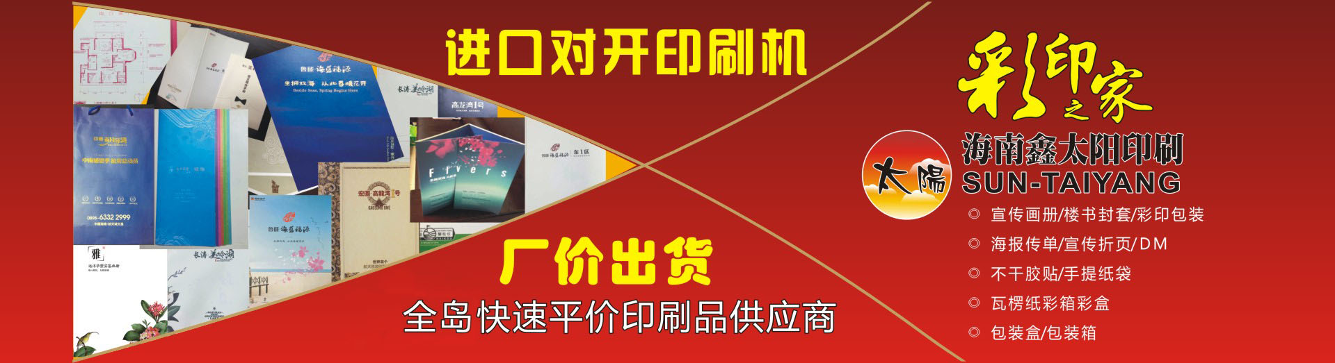 海南鑫太陽印刷業有限公司成立于2002年,主要從事生產海報畫冊、傳單簡介、精品包裝、掛歷臺歷、不干膠貼、手提紙袋、瓦楞紙包裝箱和彩箱紙盒等,公司有日本、德國等對開及四開高速彩色印刷機、自動膠裝機、自動鎖線機、自動復膜機等先進的自動化設備,業務涉及商業、地產、水產、食品、農林、藥品、化工、航空等行業的彩印包裝及宣傳印刷品。我公司另外還設有紙箱包裝廠,可以更好地為客戶配套生產各種檔次級別的瓦楞紙箱彩盒、普通紙箱紙盒、精裝禮盒等大型產品包裝,產品范圍包括花炮箱、飲料箱、食品箱、魚箱、花箱等。